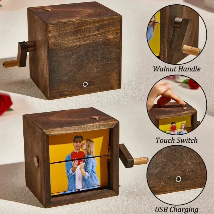 Handcrafted from natural wood, the Couples Cart Memory Reel Box lets you showcase your most cherished memories with a simple turn of the crank.